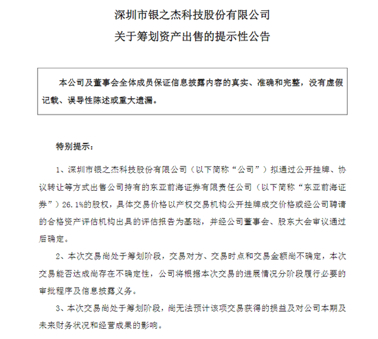 2023年12月26日晚,银之杰发布公告称,拟通过公开挂牌、协议转让等方式转让持有的东亚前海证券26.1%股权,以回流现金和减轻债务压力。彼时银之杰表示,根据公司战略发展规划,本次转让东亚前海证券股权是为了更好地聚焦金融科技主业,优化资产结构。