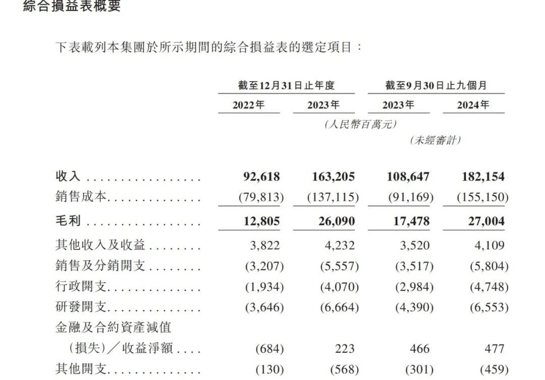 招股书显示,2022年、2023年、2024年1-9月,奇瑞营收分别为926.18亿、1632.05亿、1821.54亿元人民币;净利润从2022年的58.06亿元增长至2023年的104.44亿元。